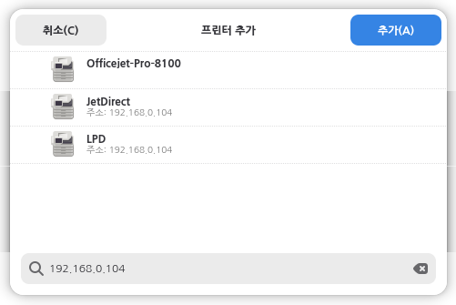 'JetDirect'를 선택하고 '추가(A)'를 누르시고