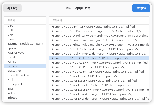프린터 설정에 들어가면 기본적으로 지원하는(HP, ...)등은 자동으로 추가되어 있습니다. 하지만 리눅스를 지원하지 않는 프린터 들은 수동으로 추가 해 주셔야 합니다.