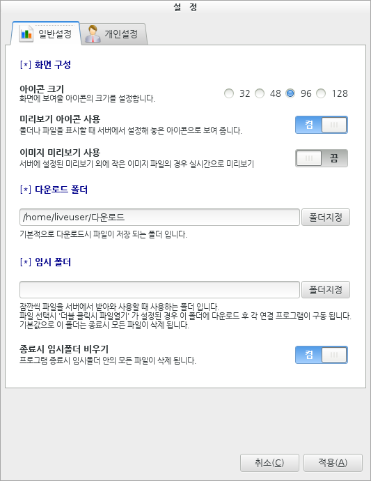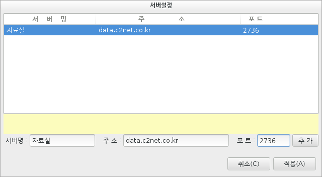 처음 실행시 어떤 서버 설정도 없으므로 접속하고자 하는 서버의 정보를 입력해 주어야 합니다. 원하는 서버들을 등록한 후 각 서버를 선택하면 로그인 창이 나오며, 사용자 이름과 암호 등이 일치 하면 서버에서 제공해 주는 폴더의 정보를 확인 하실 수 있습니다.